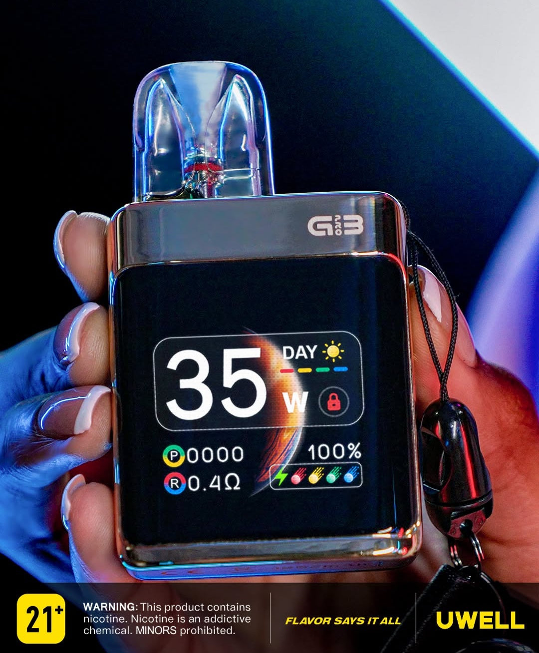 El primer koko de pantalla completa de UWELL, cuenta con una pantalla a color TFT de 1,8 con temas dinámicos que se pueden personalizar para un vapeo claro y controlado.